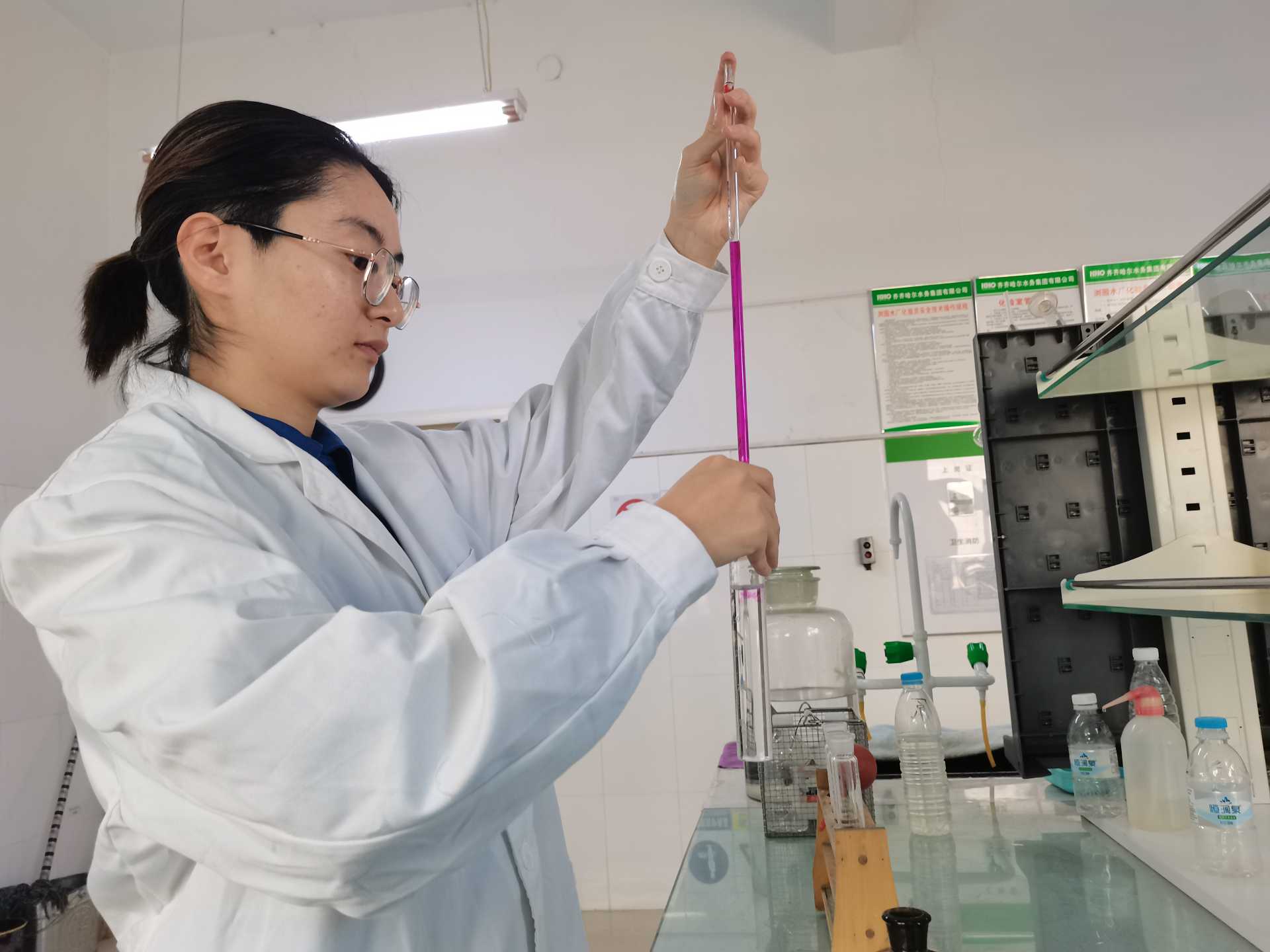 在浏园中心水厂原水入水口,汩汩嫩江水翻涌而上流进原水池,化验员陈雨莹将取水器抛入水池,这是她每天原水检验事情的第一项——取水。“正常情况,原水检测一天一次,从现在开始都提高了检测频率,原水一天两次,白天一次,晚上一次。历程水两个小时取一次,出厂水是实时监测检测。”陈雨莹将水样带回检测室,倒入相应的容器内,添加对应试剂,浊度、PH值(酸碱度)等都是基本检测项目。