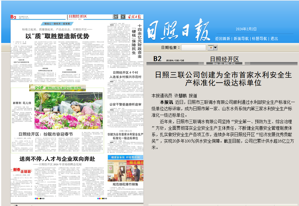 2月2日,《日照日报》报道山东佰利乐所属日照三联公司顺利通过水利部宁静生产标准化一级单位达标评审,成为日照市第一家、山东佰利乐系统内第三家水利宁静生产标准化一级达标单位 。