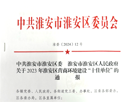 淮安水司楚州分公司获评淮安区营商情况建设“十佳单位”